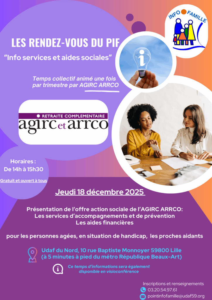 Inscription par téléphone au 03 20 54 97 61 ou par mail à pointinfofamille@udaf59.org