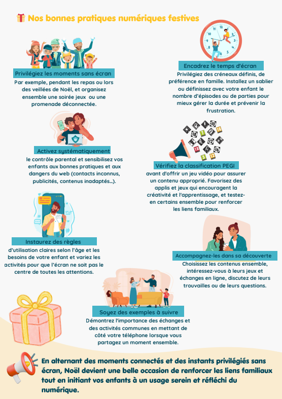 Enfin, pour aborder ces questions de manière ludique, le calendrier de l’Avent peut devenir un support idéal : chaque jour, un petit défi, une activité créative ou un conseil pour avancer vers un numérique plus équilibré et partagé.
