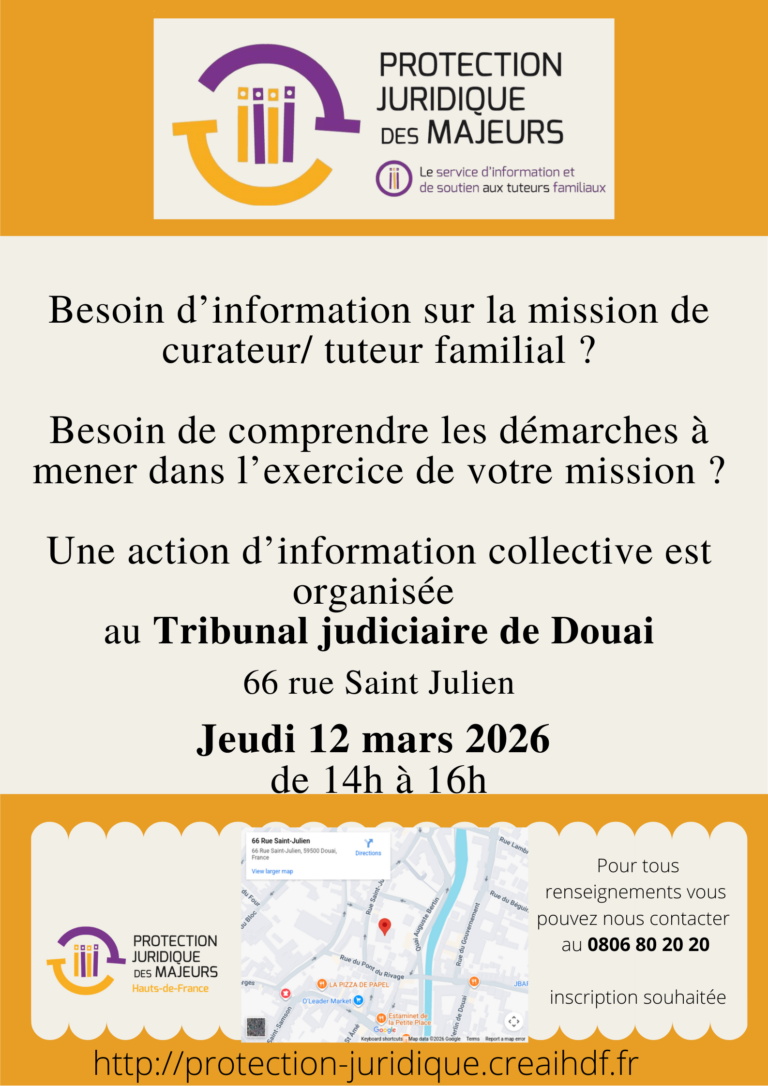 Le Service d’Information et de Soutien aux Tuteurs Familiaux vous propose un temps d’information collective organisé au tribunal judiciaire de Douai.